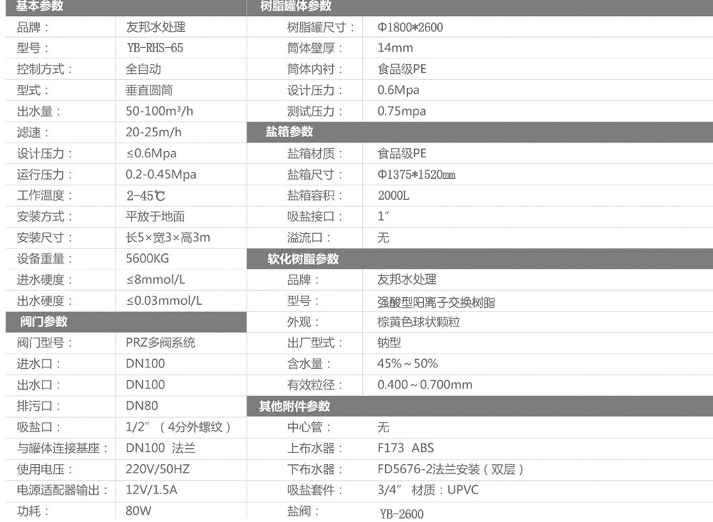 型號:YB-RHS-65,如需24小時連續出水選擇單罐單閥運行,默認樹脂罐體材質為玻璃鋼,如需特殊罐體請說明。
