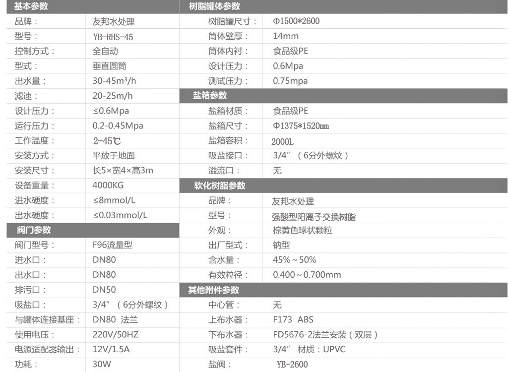 型號:YB-RHS-45,如需24小時連續(xù)出水選擇單罐單閥運行,默認樹脂罐體材質(zhì)為玻璃鋼,如需特殊罐體請說明