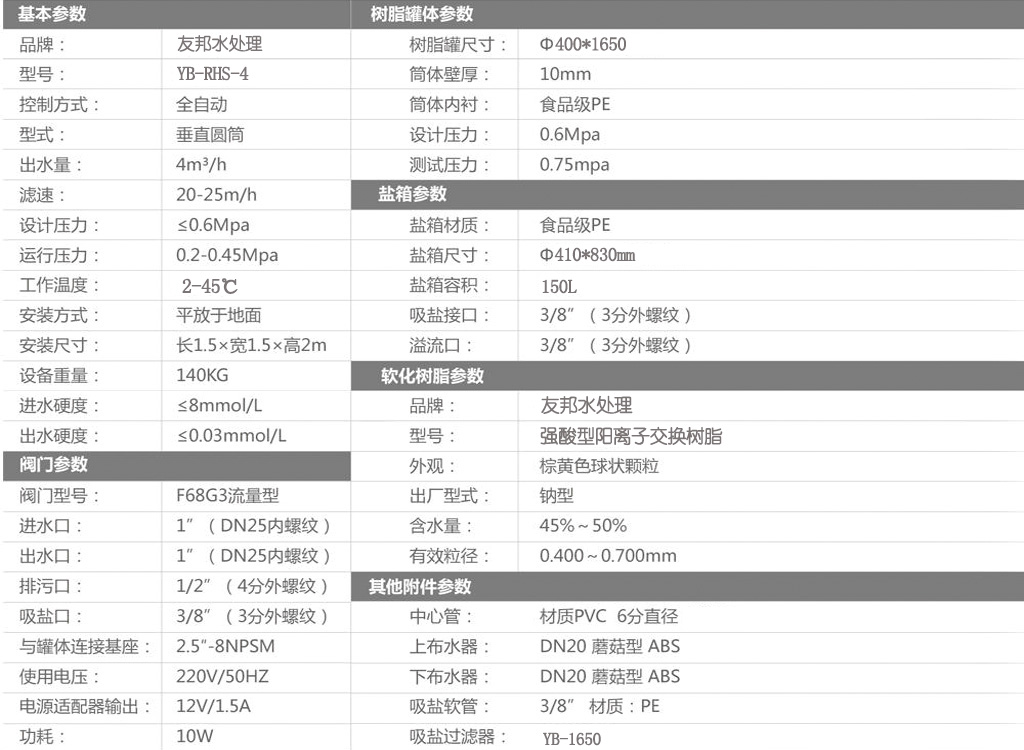 型號:YB-RHS-4,如需24小時連續出水選擇單罐單閥運行,默認樹脂罐體材質為玻璃鋼,如需特殊罐體請說明。