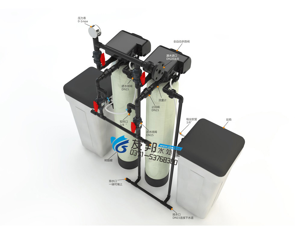 型號:YB-RHS-1,如需24小時連續出水選擇雙罐雙閥并聯運行,默認樹脂罐體材質為玻璃鋼,如需特殊罐體請說明。